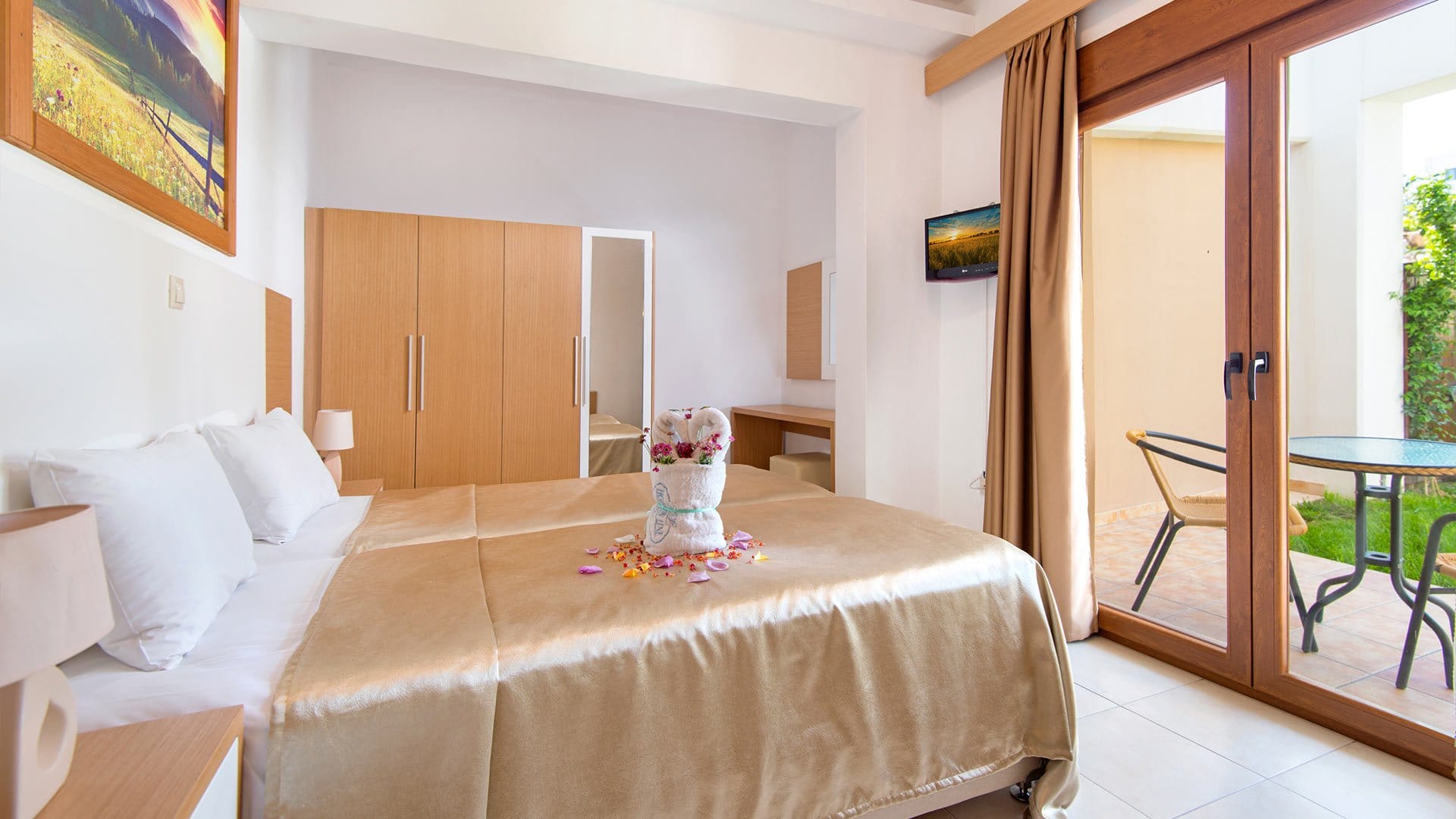 Bedroom B includes a double bed, high-quality mattress wardrobe and mirror, desk, sliding door to the garden terrace, low noise A/C and flat-screen TV.