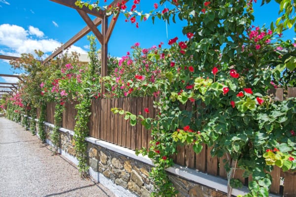 On the south side, having a direct sea view, there is a private pool with a waterfall that cascades from a two-meter-high stone-built wall.