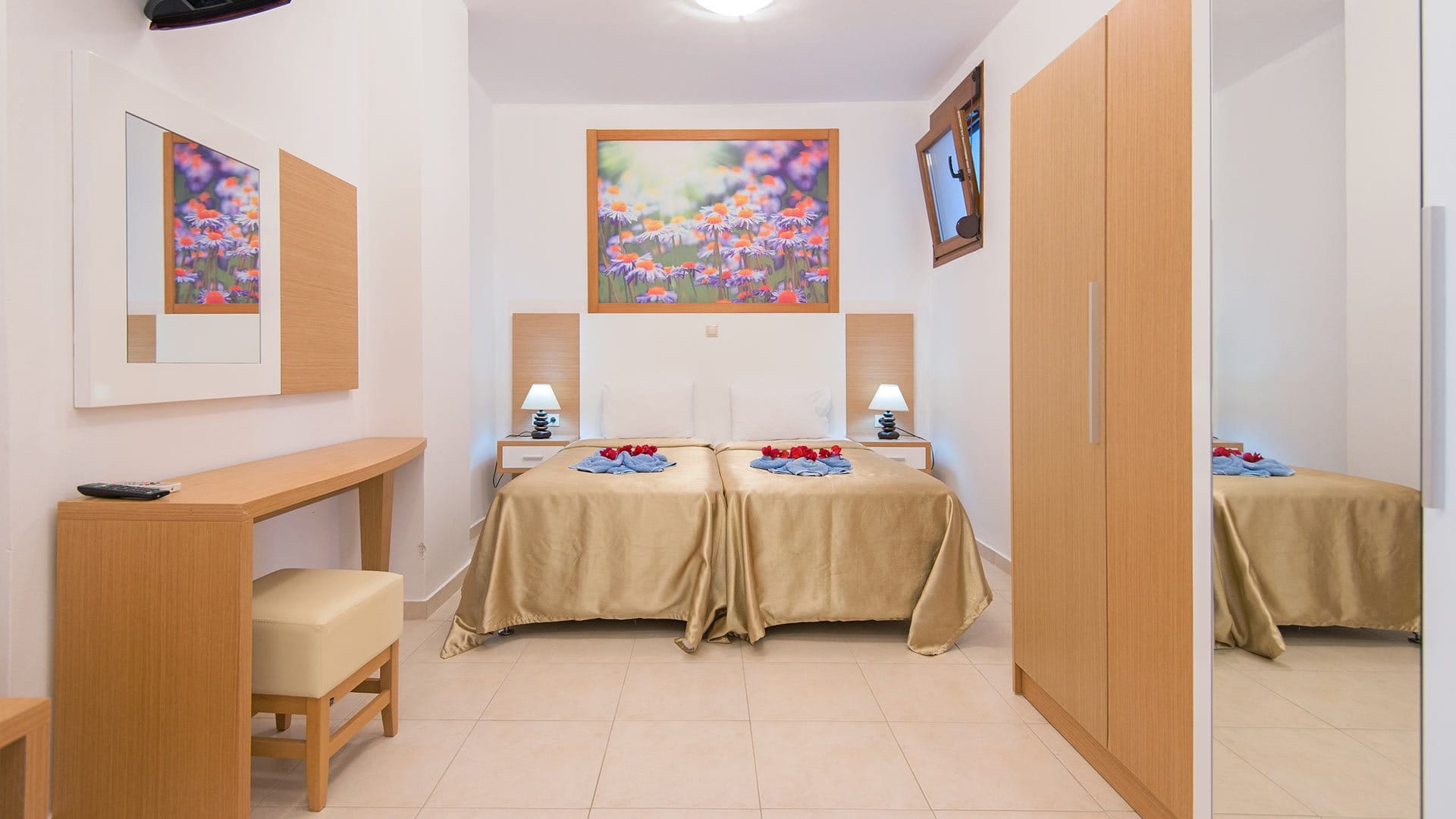 Bedroom C includes double bed, high-quality mattress, wardrobe, desk, low-noise A/C and a flat-screen TV.